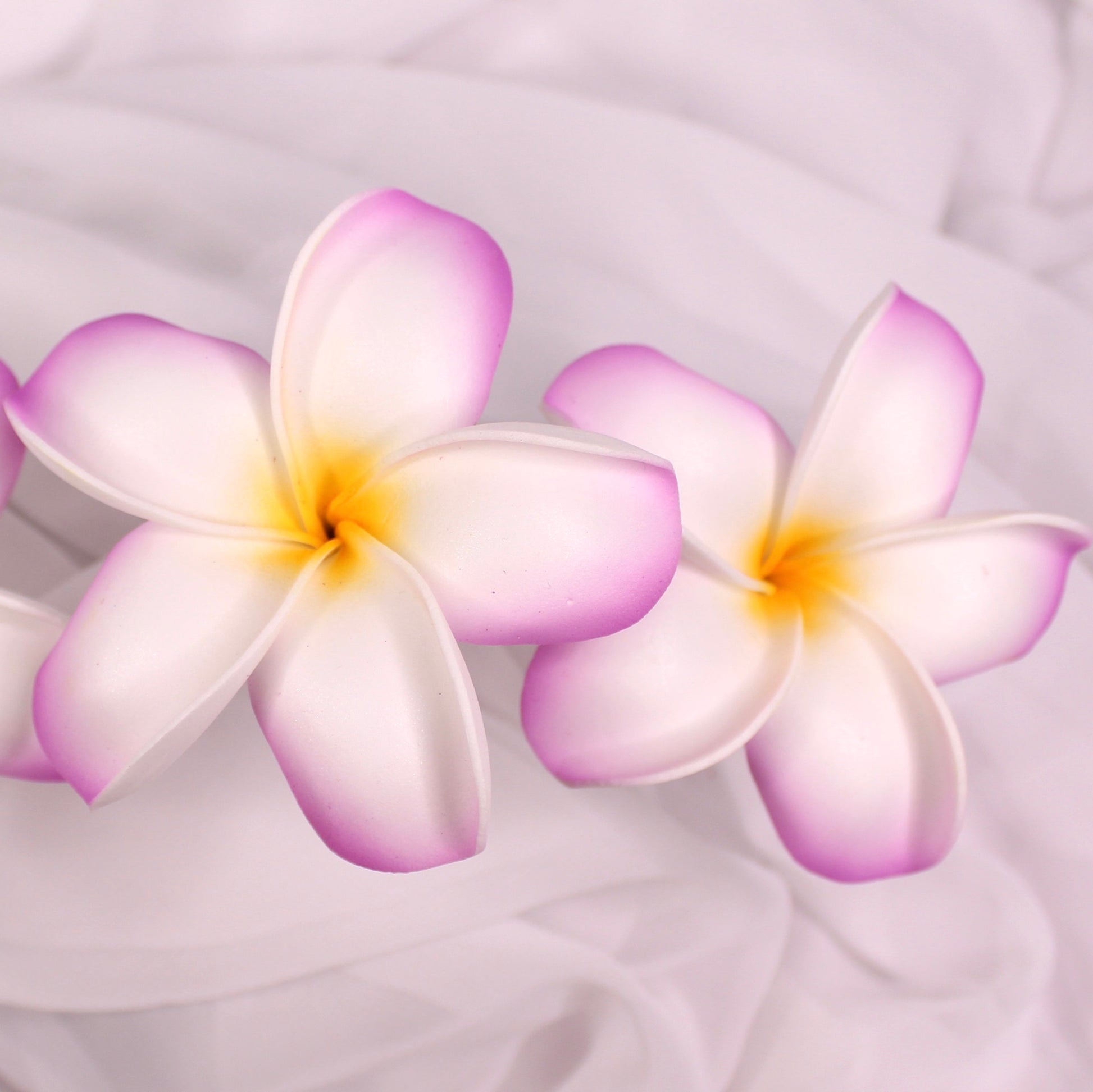 Bring a soft tropical charm to your floral arrangements with our Lilac and White Frangipani Real Touch Single Stem. Each bloom showcases gentle lilac edges fading into a sunny yellow center, capturing the natural beauty of tropical frangipani flowers. Perfect for weddings, beach-themed décor, home styling, or DIY floral projects, these artificial blooms combine realism with long-lasting beauty.