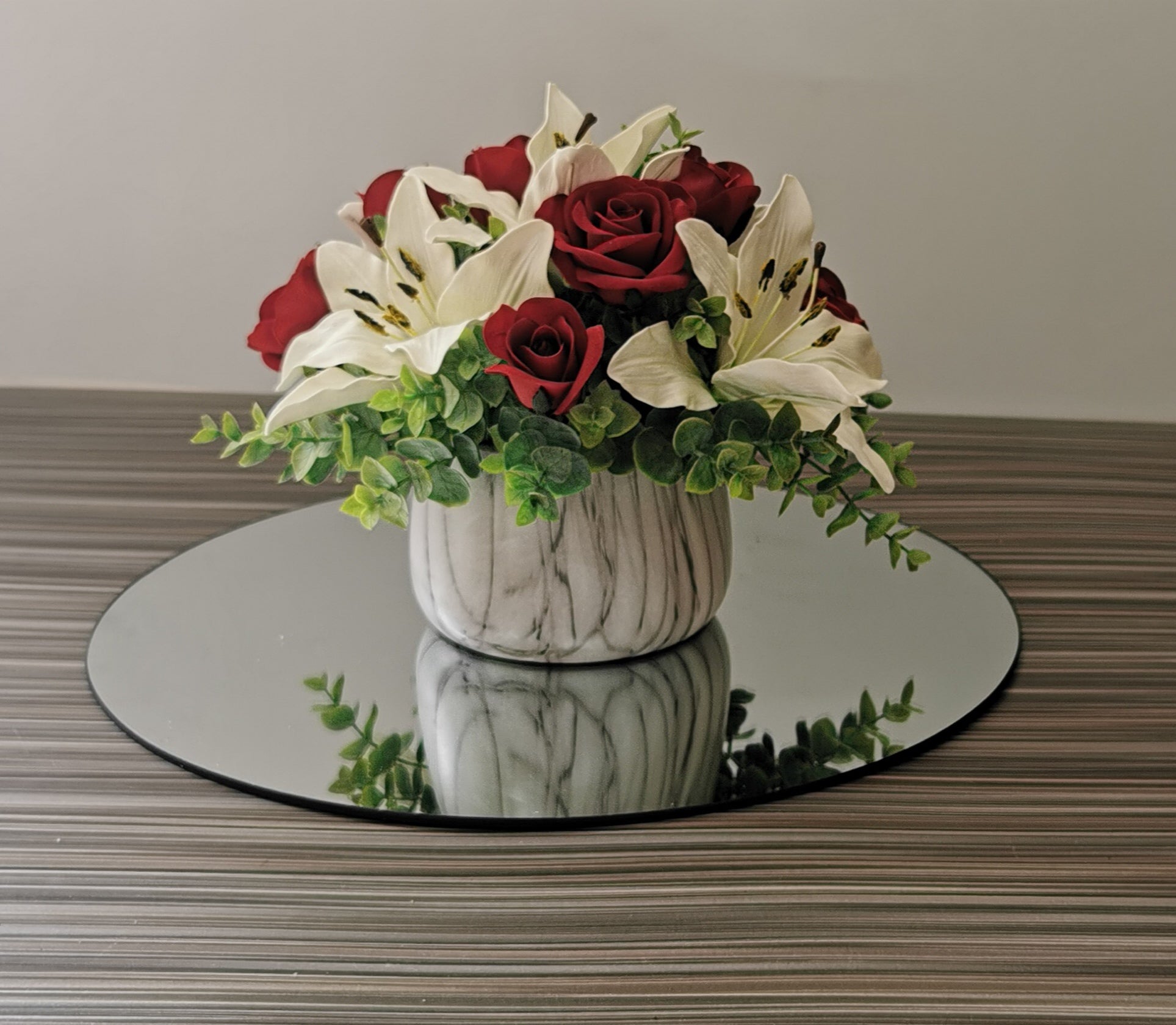 The open-faced white lilies add architectural beauty and softness, while the red roses provide bold contrast and emotional warmth. Designed for lasting impact, this arrangement delivers sophisticated beauty without the need for water, maintenance, or replacement.